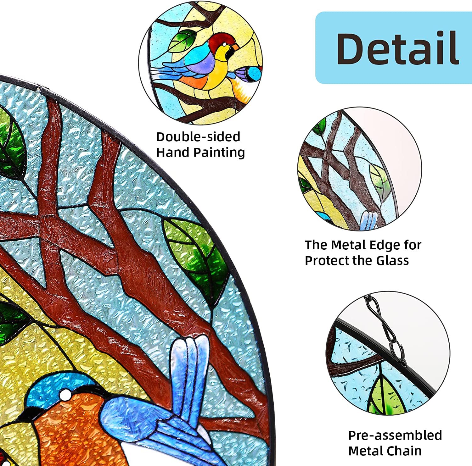 EASY TO HANG: Our Four Birds Stained Glass Panel measures 11.8*11.8 inches and will perfectly match your home's windows, walls or wherever you want to place it. Also, we have a metal chain for it so that you can hang it quickly without assembly.